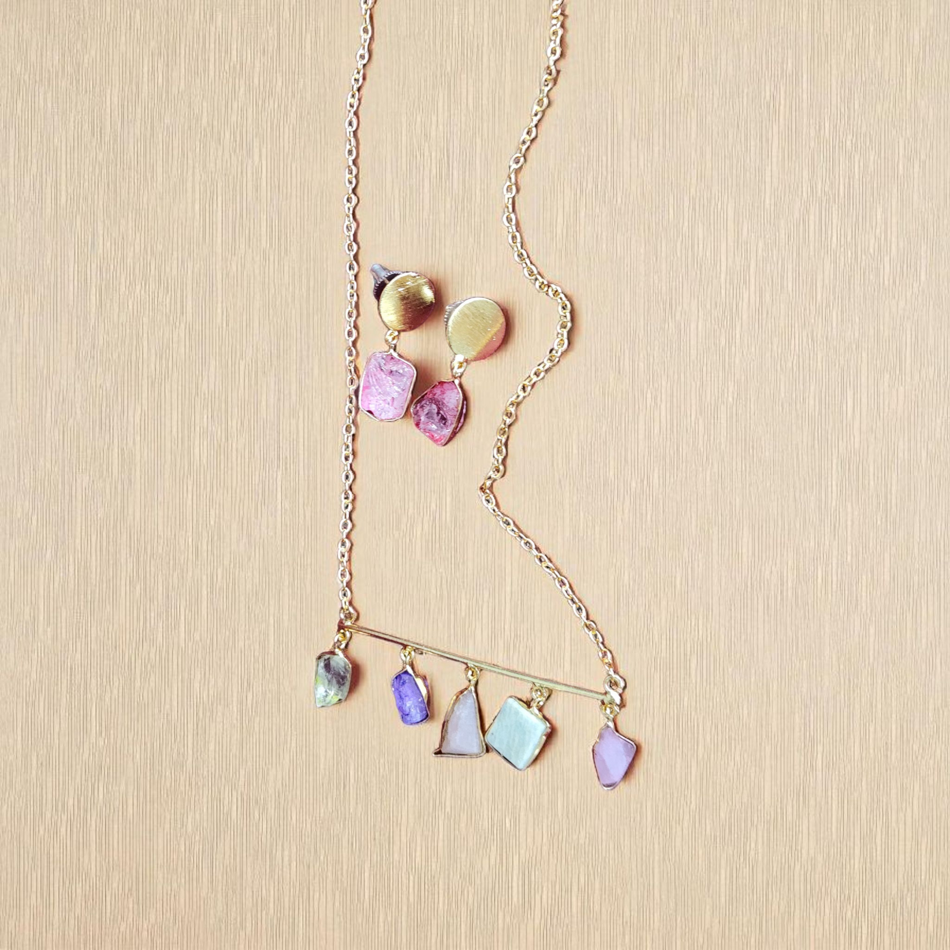 Elegant Raw Stone Necklace & Earring Set – Golden Chain with Multi-Gem Charms