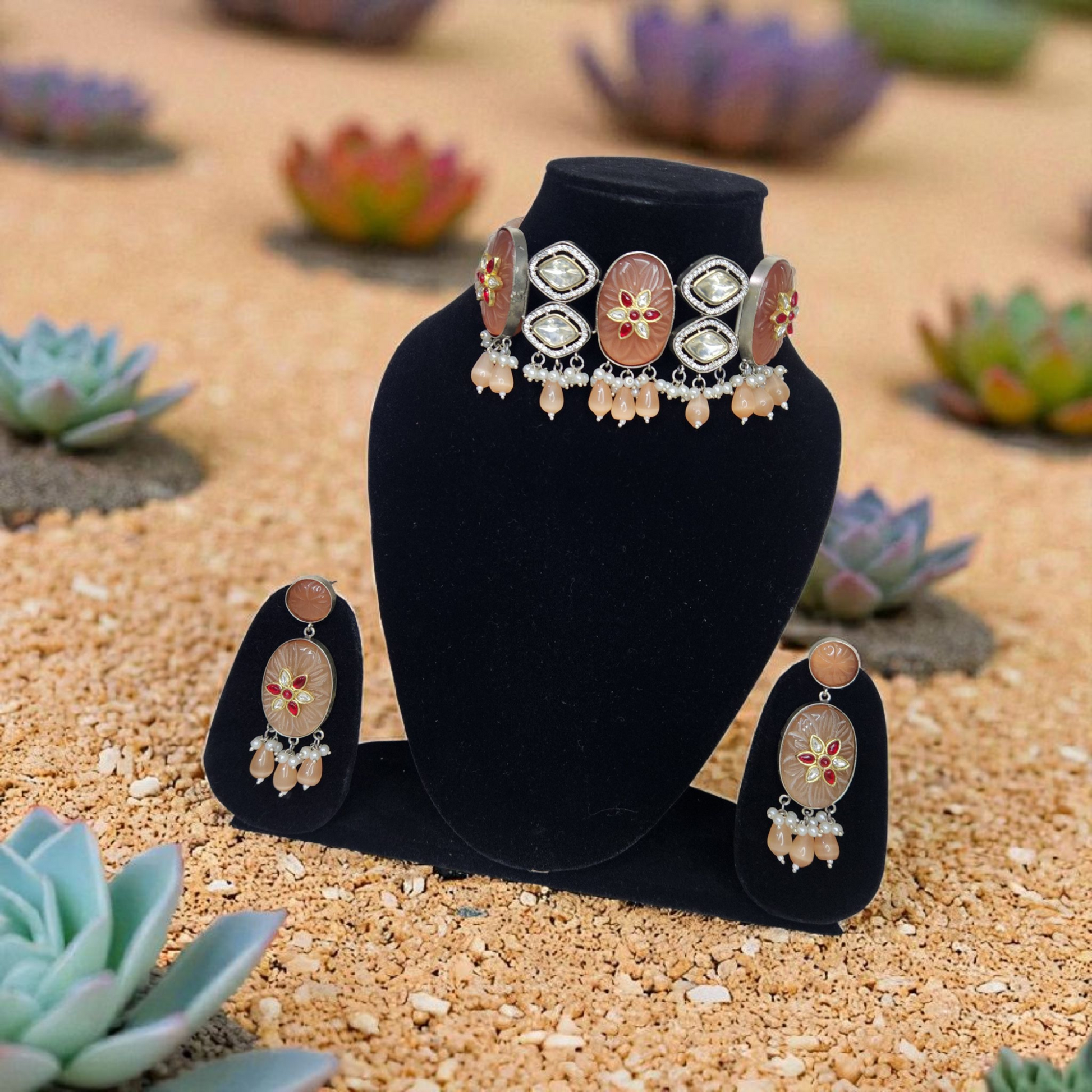 Peach Floral Kundan stone tanjore AD Choker Necklace Set – With Matching Earrings