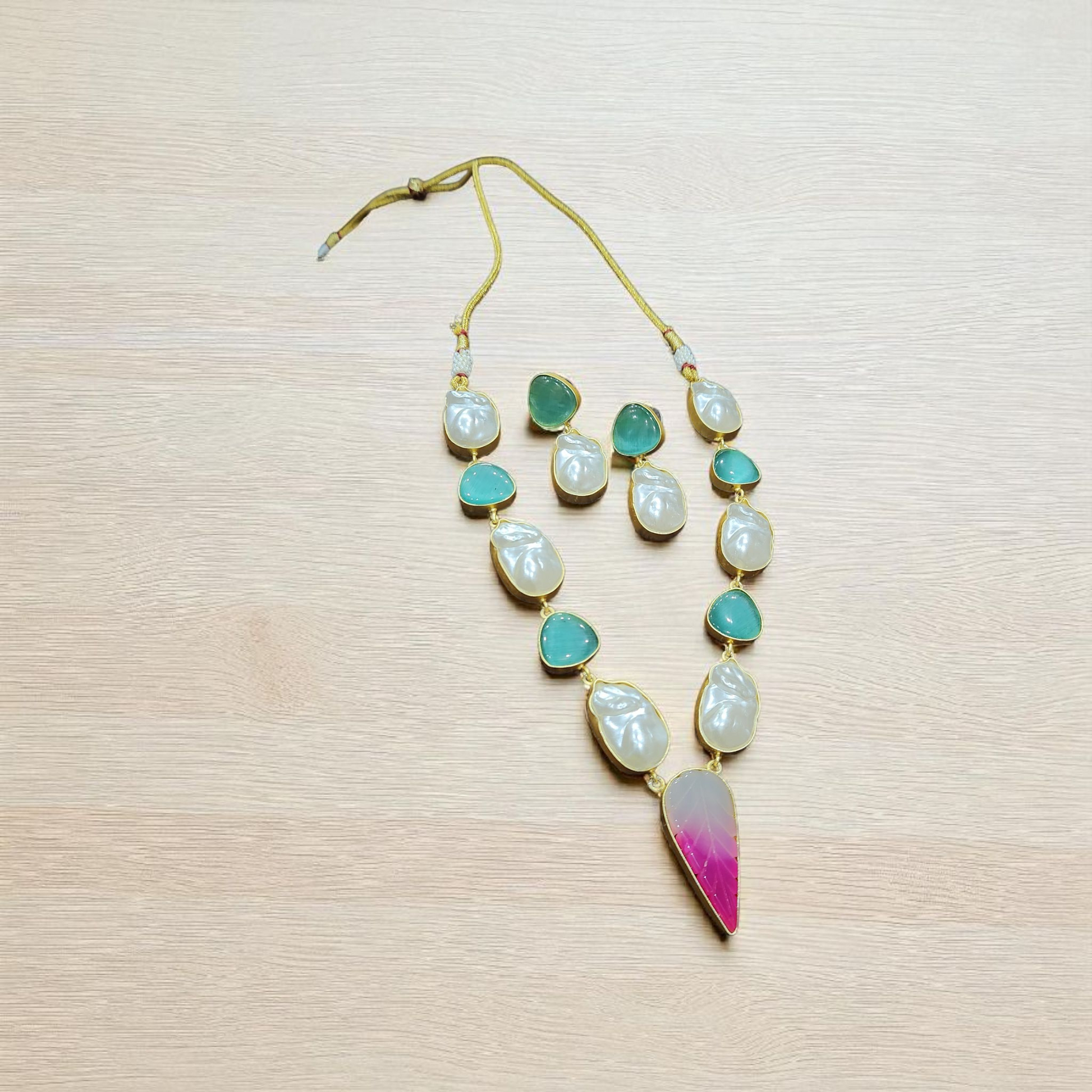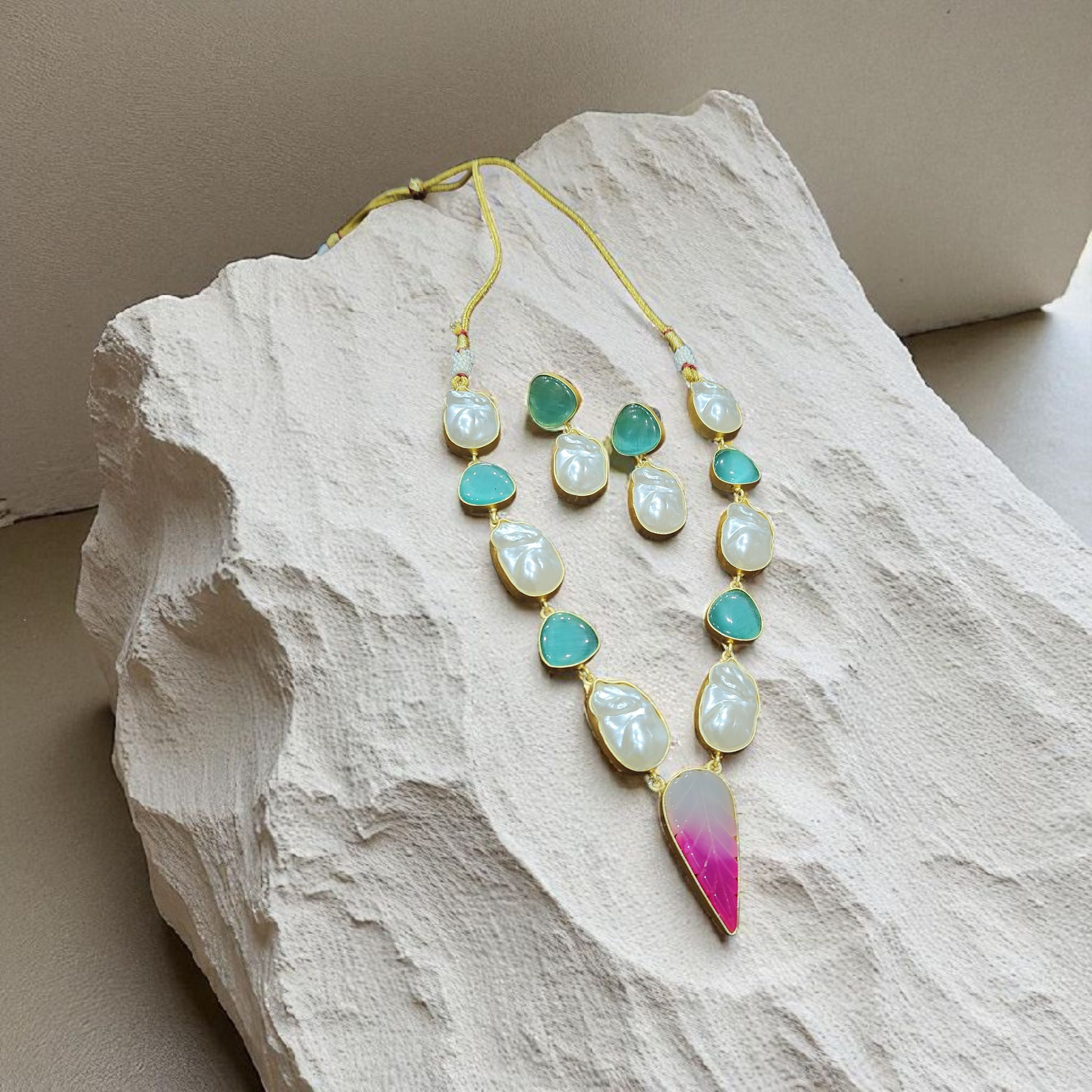 Raw cut Green &moon Pearl Necklace Set with ombre Pink uncut pearl Drop Pendant – Elegant Designer Jewellary